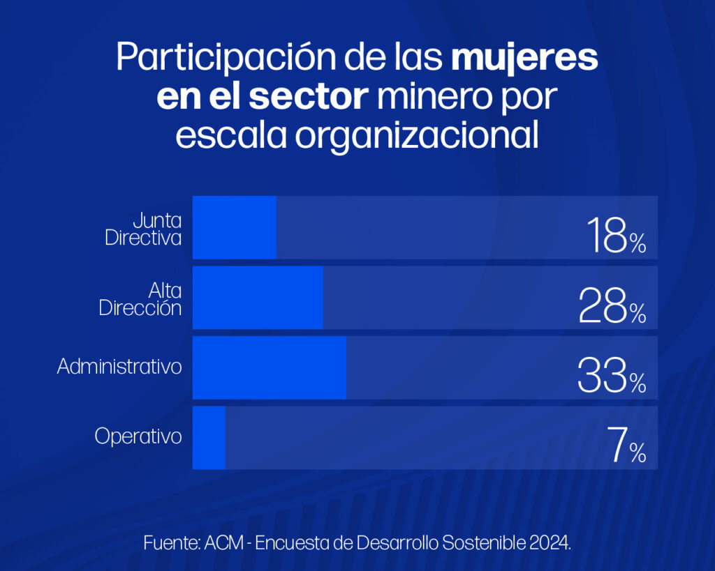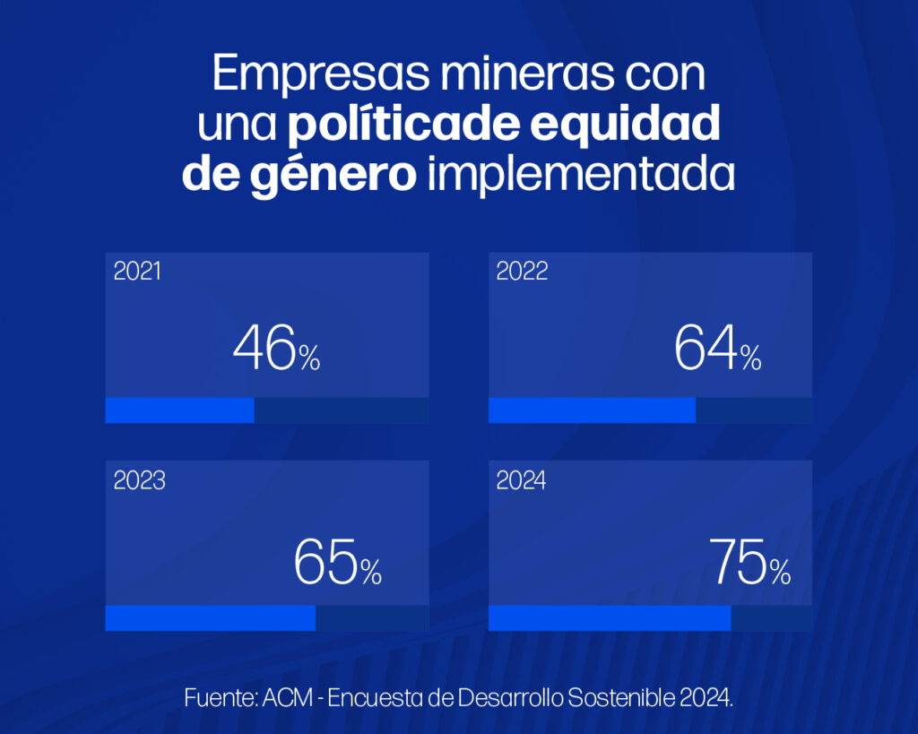 En el sector minero incrementar la participación de las mujeres en los distintos niveles operacionales ha sido un propósito desde los compromisos de sostenibilidad y productividad que tiene la industria. En tan solo 4 años la participación de empresas que ha implementado una política de equidad de género ha aumentado de 46% a 75% así como se han incrementado iniciativas como seguimiento a métricas, definición de objetivos exigentes y medibles, adopción de estándares, compromisos para eliminar brechas, procesos equitativos de selección, formación y desarrollo, convocatorias que garantizan la igualdad de oportunidades, capacitación a colaboradores y comunidades, desarrollo de capacidades gerenciales para impulsar el desarrollo de mujeres hacia cargos directivos, programas de emprendimiento y formación a mujeres en las comunidades, programas de mentoría para apoyar el desarrollo profesional de las mujeres, adaptación de herramientas y entornos de trabajo para mujeres en trabajos tradicionalmente masculinos, beneficios como licencia de maternidad y paternidad extendida, equidad salarial, conciliación de vida laboral y familiar, cero tolerancia ante todas las formas de violencia en el trabajo o acoso sexual, prevención de violencia basada en género, visibilidad y promoción de la co-responsabilidad entre hombres y mujeres en las familias, entre muchos otros.