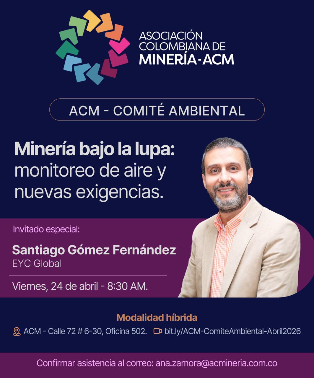 Inicio Normativa ACM | Comité ambiental – abril 2026 ACM | Comité ambiental – abril 2026 Fecha • 24 abril, 2026 “Minería Bajo la Lupa: monitoreo de aire y nuevas exigencias”, Comite Ambiental ACM – Abril 2026 Minería Bajo La Lupa. Aire – ACM